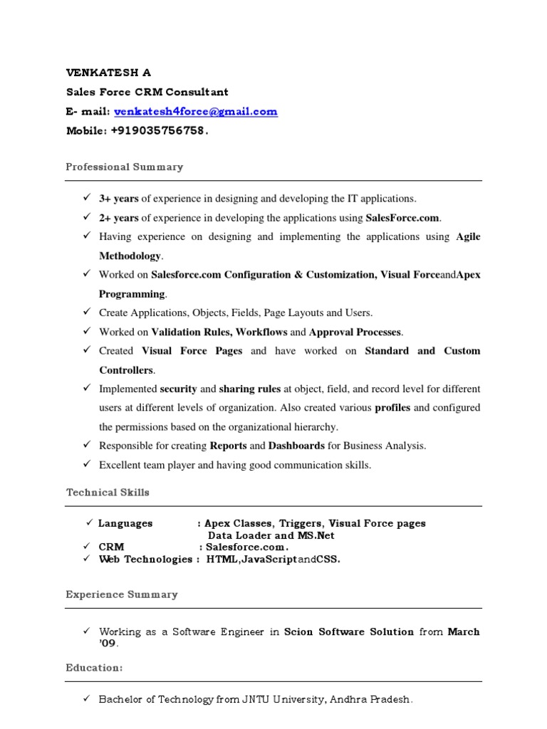 Salesforce consultant resume examples & samples. Includes a salesforce administrator resume example and guide. Create an impressive salesforce developer resume that shows the best of you! Develop requirements gathering sessions with stakeholders and translate into technical requirements. Refer to our salesforce resume sample given below to understand how an ideal profile title looks like in a resume: Crafting a salesforce developer resume that catches the attention of hiring managers is paramount to getting the job, and livecareer is here to help you stand out from the competition. 2 sample salesforce administrator resume summaries summary salesforce certified administrator with 4+ years of experience in implementation and integration for two orgsin business administration. Browse resume examples for salesforce administrator jobs. Salesforce administrators configure and manage sales and service cloud applications for companies. Free sample resume citrix administrator valid linux system admin 2019. Download sample resume templates in pdf, word formats. Looking for salesforce resume samples? Use these professional salesforce administrator resume examples to tailor your application.